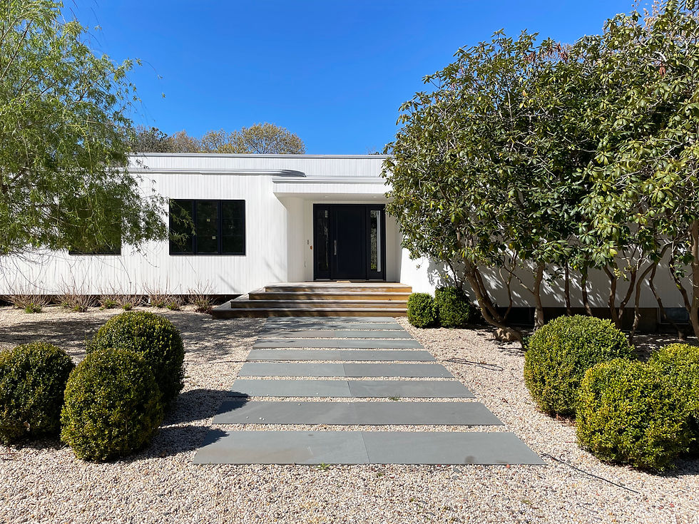 When The Open Project was approached about renovating a midcentury modern home in the Hamptons, the strategy was to maintain the rounded corners, floating volume, one-story structure and simply modernize its interior. Adding a bedroom and a garage without changing the house’s vibe, it is an evolved midcentury modern for contemporary living with more industrial windows, black steel with panes.